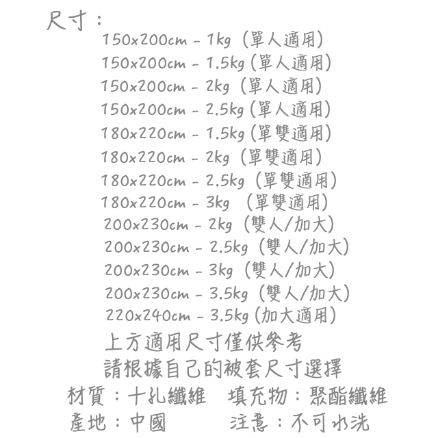 | 尺寸 | 150x200cm(1kg), 150x200cm(1.5kg), 150x200cm(2kg), 150x200cm(2.5kg), 180x220cm(1.5kg), 180x220cm(2kg), 180x220cm(2.5kg), 180x220cm(3kg), 200x230cm(2kg), 200x230cm(2.5kg), 200x230cm(3kg), 200x230cm(3.5kg), 220x240cm(3.5kg) |