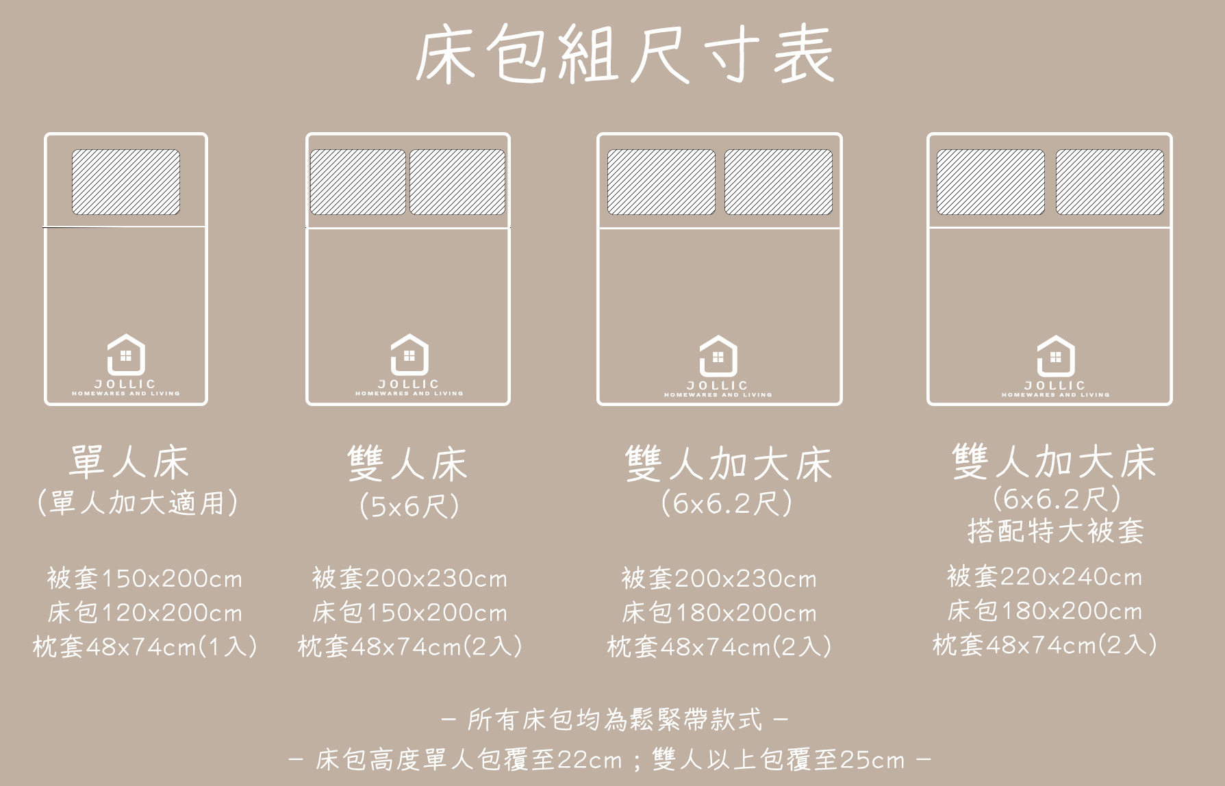 天竺棉款式的床包高度為單人22cm,雙人25cm。
