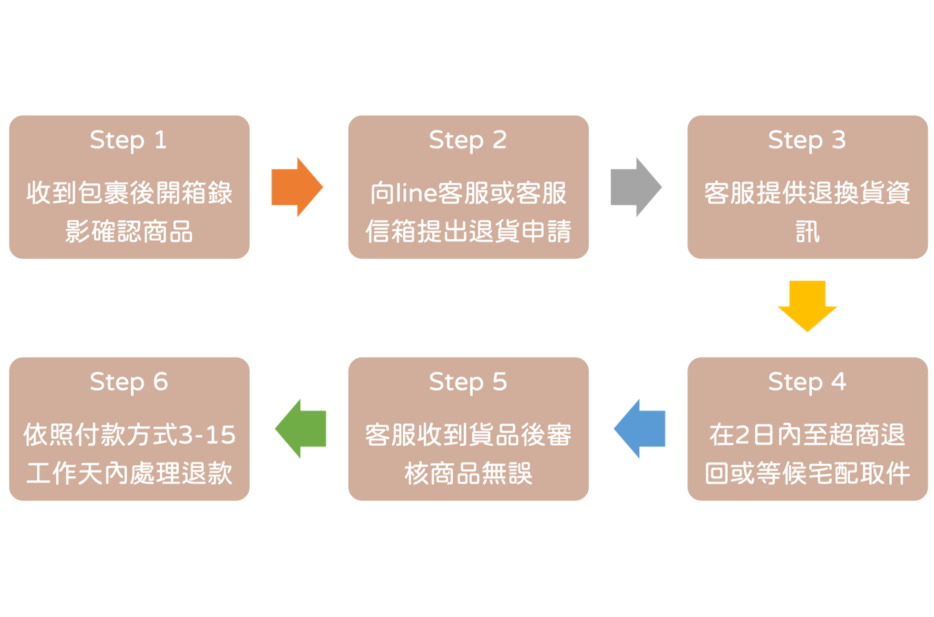 本網站所有商品(訂做商品除外)皆享有七日鑒賞期的服務。以收受商品隔日算第一天(例:5/1超商系統顯示買家已取件,則5/1算第0天,5/2算第一天),商品需於七日內(即範例中5/8日)前提出退換貨的申請。